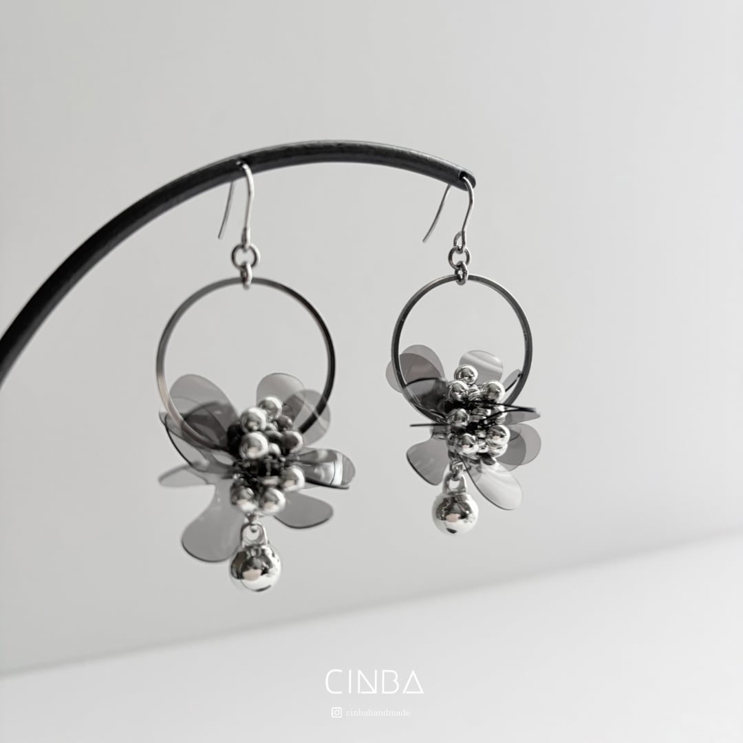 花びらのように重なるPVCパーツと シルバーフープを組み合わせたデザイン。